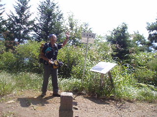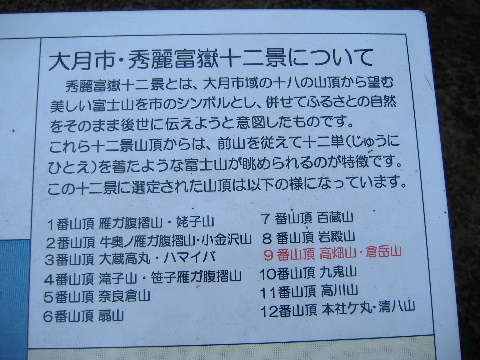 | 高畑山山頂。富嶽十二景のひとつ(高畑山と倉岳山はワンセット)ですが、この日は残念ながら富士山は見えませんでした。富士山を見るには冬か春先の冠雪している頃がきれいです。 |