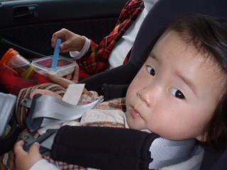 起きたマゴタン、車の中で朝食。 | |||