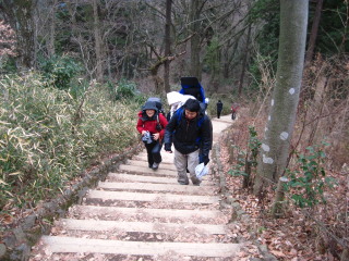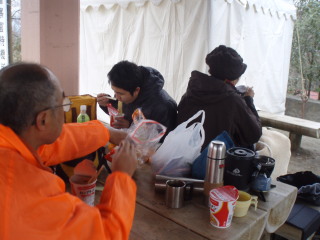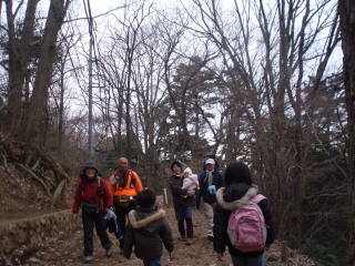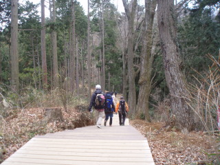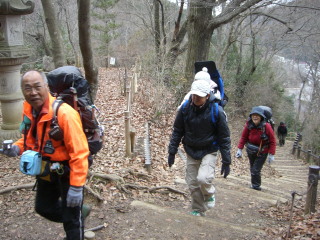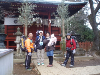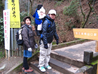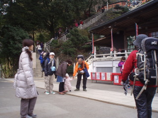 | H20年12月30日(木) 天気;晴 Member.5人(娘一家、トシちゃん、sanae) 【コ ー ス】(〜は歩、休憩時間含む) 駐車場8:25〜稲荷山登山口8:40〜東屋9:50-59〜高尾山山頂11:00-12:25〜山頂駅13:45=(ケーブル)=清滝駅13:52〜駐車場14:05 |