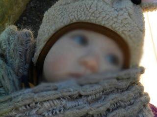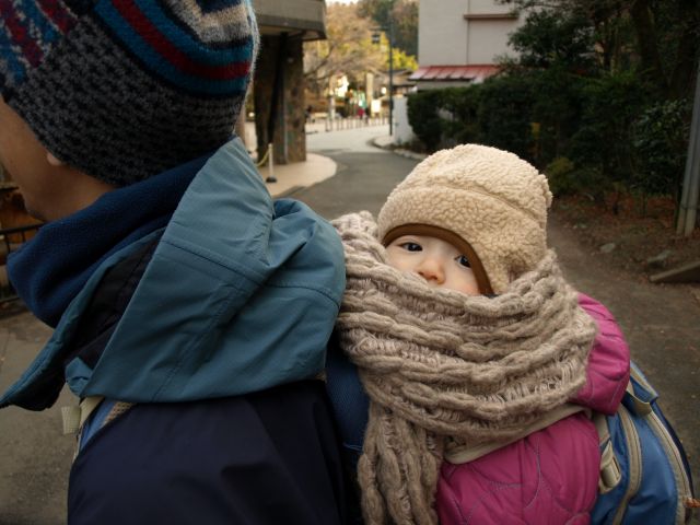サイテイ復帰の美人秘書さまのチビ太姫! 我等は2回目のご対面!いやいや益々大きくなりましたね。 この日は寒波で寒いという予報・・・ で、しっかり完全防備です。 お父さん(パパさん?)におんぶしてもらって気持ち良さそう(^^♪ |