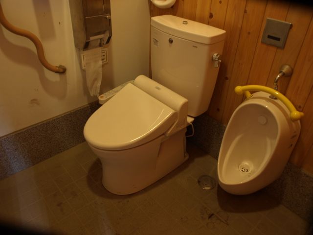 いつも混んでいるので入ったことは無かったのですが、 この日は空いていたので、せっかくですから初めて入ってみました。 もちろん洋式で水洗、しかもウォシュレットで温かい便座。 女性用には男児用トイレやおむつ交換台のついている個室もあり、中は広々しています。 山にしてはあまりの豪華さでびっくりしました! (こちらは男子トイレの中) ↓ |