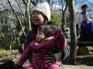 | 揺られる背に心地よく眠っていたちび太姫♪ 十一丁目茶屋側のベンチで休憩している間に目覚めました。 ![]() |