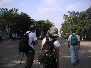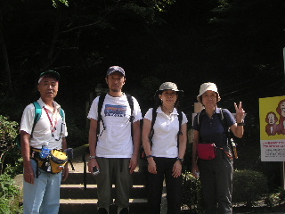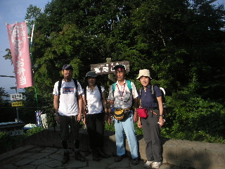 | 14:00 いつものしっかりした山のいでたちのお二人に対し、目的がビアーに走っている私たちはスニーカーという山をなめた格好。さっそくheppocoさんの遠慮がちなツッコミが・・・(^^ゞ 登山口で記念写真のあとは定番の稲荷山へ。ここは道幅が広いのでおしゃべりしながらのんびりと。 |