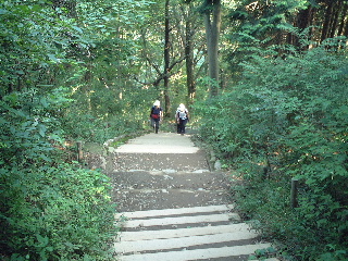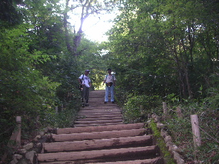 | 山頂へ最後の登り。階段が等間隔になって登りやすくなった。振り返って待っている隊長さんとトシちゃん。 | |||||||||