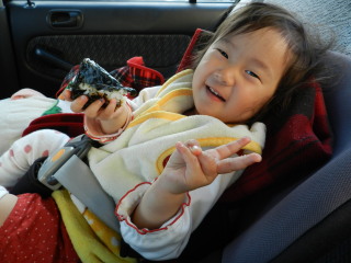 朝6時に起き荷物を車に積んでから、ぐっすり寝ているマゴタンを抱きかかえてチャイルドシートへ拉致(^^ゞ 眠ったまま乗せられたものの、目が覚めてはてなマークのマゴタン(?_?) 最初ボーっとしていましたが、いつもと違う様子にそのままお目覚め^_^; それでも驚く様子もなく顔を見てニコッ♪ |