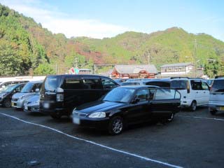 高尾山祈祷殿駐車場(500円)はまだ十分余裕がありました。 駐車場から見る高尾山塊も眺める限りまだ青々しています。 |