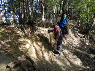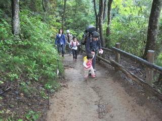 間もなく暑くなって脱ぎました。 前日は雨でとても寒かったのに、今日は行楽日和。 登山道はしっとりと水を含んでいます。 マゴタンの可愛いリュックには少しのお菓子とハンカチとティッシュが入っています。 |