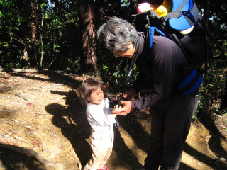 山頂でもカメラをもって写真を撮りたがったマゴタン。おじいちゃんを撮ったり自分の顔や服が撮れていたり(笑) 撮るだけ撮って、満足して下山しますが、 |