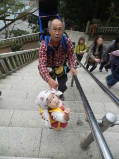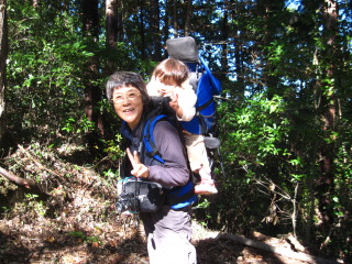 | 10分ほど休憩し、今度はおじいちゃんに背負われていきます。 | ![]() |