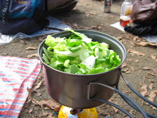 | ようやく空いた場所を見つけてお昼にします。 思ったより暑くなってしまったけどお鍋です^_^; |