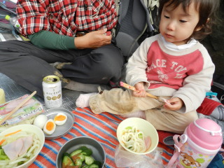 | メニューはさっぱり味のうどんとハム、キュウリ、味付卵、生キュウリ(味噌味)、チーズ、家で作ったふかしイモなど。マゴタンの好きなものばかり(^^♪ デザートはゼリーとプリンとヨーグルトを持ってきたけれどマゴタンはゼリーをチョイス。あとはお持ち帰りになりました(^^ゞ |