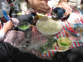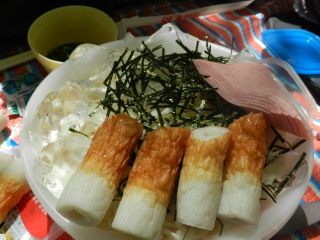 山めしは冷やしうどん。氷も薬味も用意してタァータンやるな〜(^_^)v |