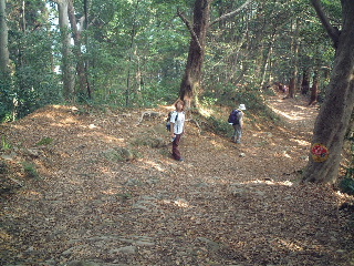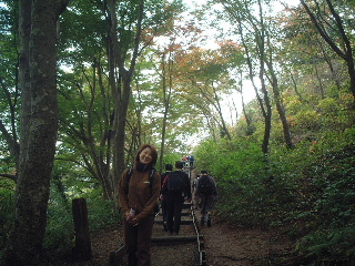 東屋に着くと期待に反して遠望は霞んでいた。そのまま先へと進んだ。このあたりの樹林は緑が多く紅葉というには程遠かった。山頂は混んでいそうなので捲いて、もみじ台まで足を伸ばした。山頂経由でもみじ台方面へ行く団体に遭遇し、広い登山道を埋め尽くすその人数に圧倒された。