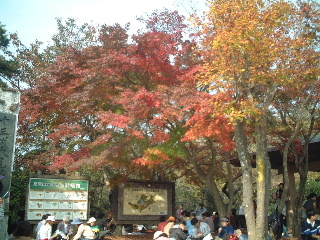 その団体を見送ってからもみじ台に着くと、そこも場所取りのロープやブルーシートが張られていた。もみじはほんの少し色づいていただけだった。結局山頂へと戻ることにした。