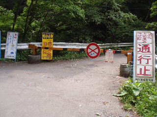 | 通行止めの林道菱山深沢線。5月21日から10月12日まで工事と書いてありました。 | |