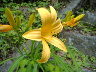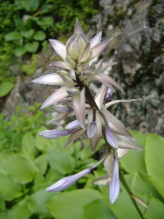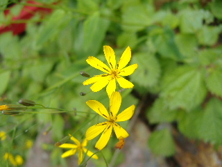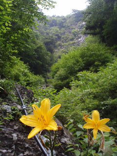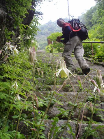 | 階段が続きますがやわらかい緑色が気持ちよく、そして階段の端にはオダマキの花がいっぱいで思わず歓声です。 | |