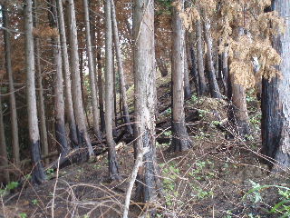 | 激しく燃えた様子を目の当たりにしながら見えていた林道へ。 | |