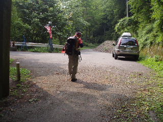 | 幸いその後対向車も無く無事に大滝不動奥宮に到着。ここに1台停まっていました。途中ですれ違わなくてよかった〜と話していたら、丁度その持ち主が下山、しばしお話して情報交換です。 地元山梨の若い男性で、その方に撮っていただいたツーショット。今回はこの後山では誰にも会いませんで、静かな散策となりました。 |