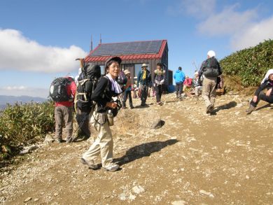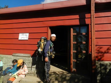 肩の小屋に近くなると登山道が広がり、後続の人を気にせずマイペースで歩けて幸いでした。 ようやく肩の小屋に到着。 |