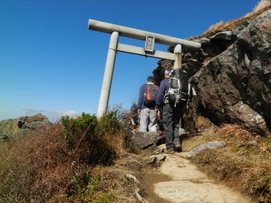 奥の院。奥の院よりながめる茂倉岳、一ノ倉岳。 出来ればあちらまで行きたかったのですが、 出発遅く、時間もかかりすぎ、とんでもありませんでした^^; ここでお参りし、風をよけて大休憩。 |
