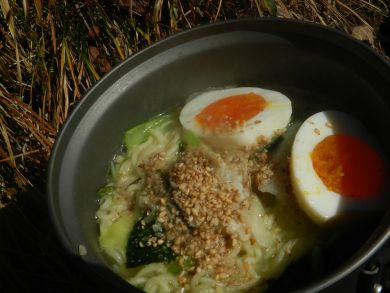寒いと思って用意してきたラーメン。気温は10度くらいでしたが暑かったです。 野菜も少し持ってきたのですが、コンビニで冷凍の肉入りカット野菜を見つけ、味付卵と共に買ってきました。 |
