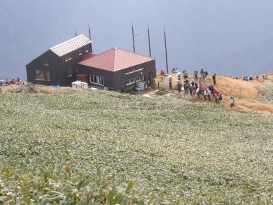 右下の肩の小屋。トイレも渋滞ですが、これでも空いてきたのかもしれませんね。 |