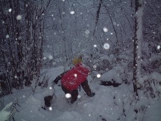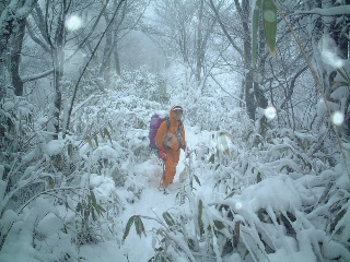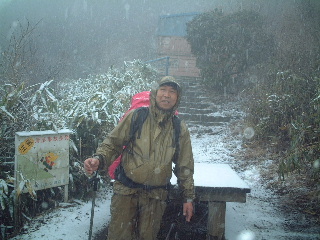 用木沢に添いながら何度か徒渉し、犬越路の方へ向かっていくと雨が霙となり、やがて雪に変わっていった。30センチは積もるという予報ではあったが、この時はまだ新雪がうっすらと積もっている程度だった。だんだんと降雪量が増え、腕を組んで黙々と登っている泥助さんに「下山する頃は下も積雪でZ(泥助さんの車)では帰れないかもよ」と冗談で口々に脅かす。そのせいか泥助さんの表情も心配そうに浮かない顔になってきた!?(泥助さん脅かしてごめんね)。 こんな状態でデジカメを出せないまま、きつくなってきた登りを詰めると人の声が聞こえてきた。犬越路だ。その頃には辺り一面雪景色。もちろん遠望はきかない。檜洞丸も全く見えない。避難小屋から賑やかな声が聞こえてくるのが妙にミスマッチだ。デジカメが濡れるのを気にしながら風景を写して小屋へ入ると人でいっぱいだった。隙間を見つけて座り、温かい飲み物を飲んで軽く食事。檜洞丸への登頂を諦めた人、大室山へ向かう人、それぞれの雑談の中で、体から立ち上がる蒸気と鍋からの湯気が小屋の中を活気づけている。外は静かに雪が降り続け、木々が真っ白になり、手すりの積雪も早や数センチ。