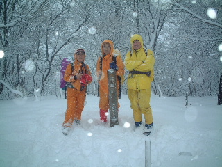 一息ついてから出発。直前に小屋を出た人が大室山に向かっていた。途中のベンチで休憩していたのでここからは私たちが先行。トレースのない、ヴァージンロードを進んでいった。まさにこの日に積もった新雪、快適だ。時々迷う所もあったが、大きくコースを外れることはなかった。メンバーが4人というのは心強い。 分岐に出て大室山へと向かう。泥助さんが先頭となり、ピークを踏む。山頂といえども樹林帯に囲まれ、登山道の通過点といった感じだ。檜洞丸や周囲の山から眺める大室山の堂々とした風格の割に、チョット残念。ピークを踏むのは私は二回目だが、あまり印象に残っていないのはこの展望の無さなのかもしれない。この時山頂の積雪は15センチくらい。足下を探るとこの日だけの積雪のようだ。