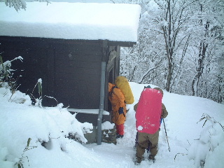 丁寧に記録をとっていた。ここからまたちょっと登りがしんどいとだめちゃんに脅された。なるほど、なるほど・・・、しかし30分もすれば小屋に着くだろうと覚悟して登っていく。しかし、コースタイムを切って到着。一同安堵。 小屋は坂元さんの言われるとおり、トイレつきストーブつきで快適。ただしストーブはマキが使い尽くされたあとで皆無、周りは雪で枯れ木も落ちていず、拾うことも出来なくて、使うことはできなかった。これでは遭難などの非常時には使えないな・・って、ここではそんな心配もないか!でも今回ばかりは外の風景を写真に撮れば、だれも丹沢だとは思わないかも知れないほどの雪山。その心配、なきにしもあらず。