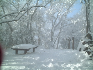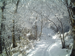 三日目(12/23) 山の夜は長い。皆、夜中に何度も目を覚ましたと言いつつ、朝までシュラフの中。なんと11時間横になっていた。 6時頃起床すると外にはきれいな星と月。やがて朝日が上がりみなでご来光を仰いだ。爽やかなキラキラした朝だった。皆で記念写真を撮ってから朝食を済ませ、片づけして出発準備。 先ずは畦ヶ丸山頂に登る。下山までのコースタイムは約2時間。しかしこの日は写真を撮りながら、ゆっくりこの丹沢の雪山風景を楽しもうとのんびりモード。この風景も1000mほどまで下がってしまえばもう見られないだろう。 急がず、とにかく見事な霧氷を眺めながら、のんびりとスノーハイクを楽しんだ。 途中のベンチで休憩。時間的にも最後の景観を堪能し、その場を後にしたころ、下から登ってくる人たちに出会った。ほとんどが、合羽なし、スパッツなしだった。雪も雨も降っていない良いお天気ではあったが、霧氷は上から降ってくる。体が枝に触れば容赦なくまとまった雪が落ちてきて雪煙の中だ。既にトレースがあるとはいえ、ズボンの裾周りは雪がからみつく。私たちは皆昨日と同じ、合羽を身につけ完全装備。