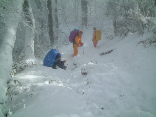 ここでこのあとどうするか検討。予定では加入道山を回って下山だったが、ここから加入道山へのトレースは無論無い。明るい時間に下山するには無理がある。ということで、登ってきた道を引き返すことにした。 しかし降り積む雪で、登りにつけた踏み後も部分的には無くなっていた。私は最後尾だったが、先頭を行く人は大変だったようだ。それでも皆、新雪が嬉しく喜々としていた。水分を含んだ雪は重く、枝が垂れ下がり、私たちが通過するたびに触れた体がそれらの雪を振り落とす。前の人が通過した後の時間差攻撃がまたたまらない。後ろからみていて可笑しかった。もちろん私も被害にあうこと数回。足下は滑りやすくそれぞれに尻餅つきながらの下り、それもまた面白かった。尻セードするほどの急斜面ではなく、極端なヤセ尾根があるわけでもなく楽しいスノーハイクだった。