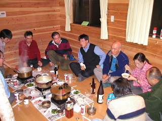 コテージ内のお風呂に入り、既に集合している皆さんに遅れてコテージへ。面識のある方、初対面の方総勢14名(日帰りの泥助さん、翌日日帰り参加の亜美さんを含めると総勢16名)。メールでやりとりしていたり、HPや機会ある毎に写真などで拝見していたこともあって、紹介がなくとも皆一目で名前と結びついた。和気藹々と話題が進み、山歩きという一つの趣味を通じて、こんなにも一つになれる。素晴らしいことだと思った。