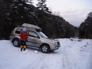 | 前夜カズさん達と別れた後、コンビニで行動食を調達してから唐沢鉱泉の駐車場へ。唐沢鉱泉は明るく電気が点いていました。営業しているようです。宿泊者用駐車場は平らですが、その下の登山者用は宿への登り坂途上にあるためどうしても車が斜めになってしまいます。再び少し下に行き、少し広がった平らな路肩で車中泊。5時起きで朝食、着替え、準備を整えて再び唐沢鉱泉の駐車場へ行きました。 |