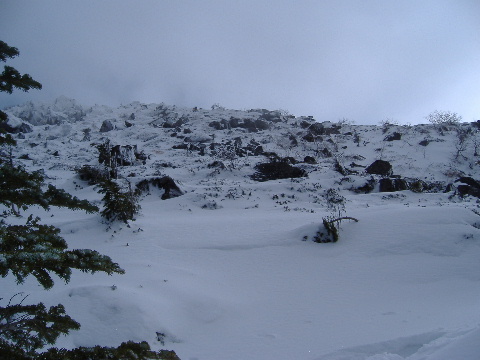 その鞍部から少し上がったところで西天狗岳を見上げるとガス。