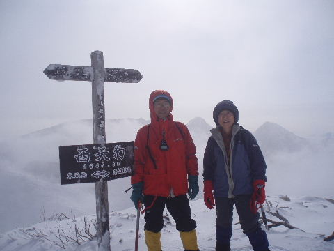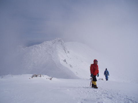 東天狗岳を下山。少し下りただけなのに山頂はガスでうっすら見えるだけ。山頂滞在12、3分でしたが楽しめました。気温はマイナス9度くらい。