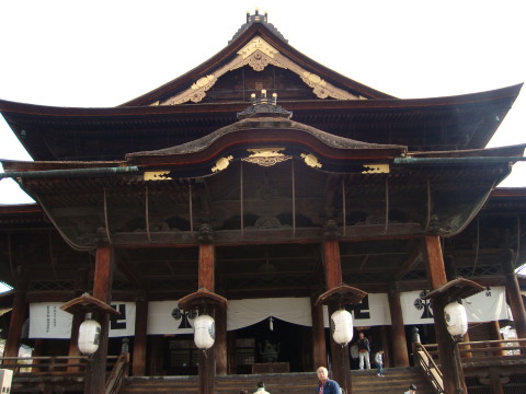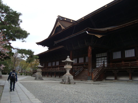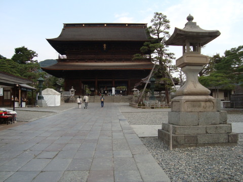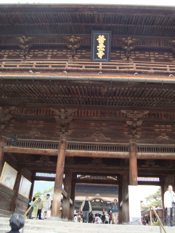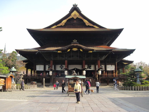 | 本殿(国宝) ![]() 善光寺はいずれの宗派にも属さず 天台宗の「大勧進」と25院、浄土宗の「大本願」と14坊によって 護持・運営されているそうです。 |