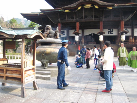 | 本殿前のお線香台の下には ご開帳の時に立てる柱(大回向柱)の穴があります。 ![]() 数え年で7年に一度のご開帳は御本尊に触れて ご利益があるのだそうですが、 ニュースによるとものすごく混みます。 最近ではH21年4/5〜5/31でしたので 次回はH27年になります。 |