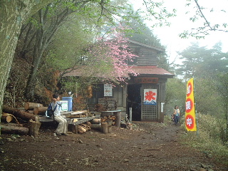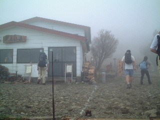 花立山荘まで来れば一安心。「氷」と書かれた旗が目に入るが一休みすれば寒くなるくらいだった。展望は案の定望めず。