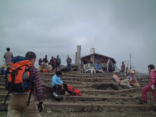 案の定、いつもながらの賑やかさ。いくらかガスがとれて、丹沢山や蛭ヶ岳の見えてきたのが嬉しい。富士山はまったく姿を見せず。ここでの私の富士山眺望は野球選手の打率ほどの確率だ。それより低いかも知れない。