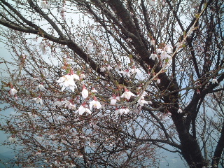 左【?サクラ・・・白い桜】 8時出発。林道沿いには八重桜が数本満開。馴染みのある