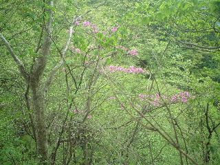 左【新緑の中トウゴクミツバツツジが引き立つ】