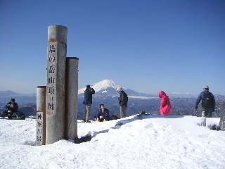 山頂は既に大勢の人でいっぱいだった。またしてもきれいな富士山の姿にやはりカメラを向けてしまう。南アルプス、八ヶ岳もきれいに見える。目前の丹沢山や蛭ヶ岳にもまたいつか足を延ばしてみたい。大島はかすかに見える程度、東京湾や房総半島も少しぼやけていたが、相模湾はこの日も見えていた。筑波山は残念ながら見えなかった。やはりお正月休みの空気がきれいなときでないとなかなか見えないのかもしれない。