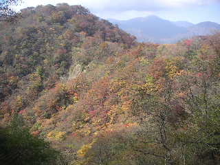 いつもきついと感じる階段をようやく登りきって到着した花立山荘で一休み。そこから眺める山の斜面は紅葉が始まっていた。花立山荘から金冷シまでの眺めは素晴らしかった。紅葉はまだ早いだろうと期待していなかっただけに感激。じっくり堪能。