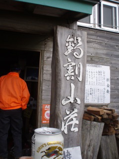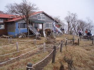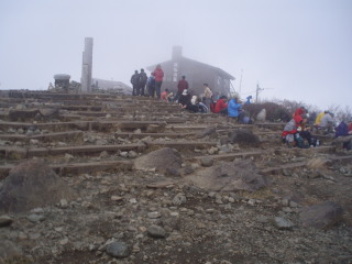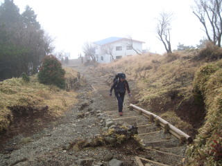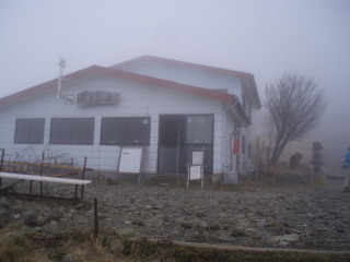 | 急な階段を登りきって、ようやく花立山荘。予報は曇りのち晴れでしたが、山はガスったまま。 | ![]() |