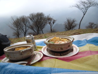 | 一滴残らずきれいに食べた後、私達は必ず土鍋をペーパーできれいに拭き取ってから返すようにしています(拭き取ったペーパーは勿論持ち帰ります)。どうせ洗うのは一緒と思われるかもしれませんが、水が貴重な山小屋ですし、こびりついた汚れを落とす手間や水の汚れ方を考えたらいくらかでも協力できるのではないかと、せめてものお礼返しと自己満足です。共感してくださる人が少しでも増えてくれたら嬉しいです(^^ゞ 山の上だけに、残す人の器をみると勿体ないし残念に思います。 |