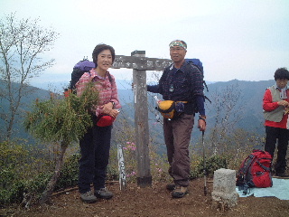| ひたすらの登りで、登りつめれば山頂。山頂は狭い。のんびり休んでいるとたちまち山頂はいっぱいになり、賑やかになった。 山頂からはやや春霞がかかっていたが、周囲の山が見渡せ、奥多摩の雲取方面も見えた。簡単にお昼を済ませ、団体さんもいたので山座同定もそこそこに、びりゅう館方面へ下山。松姫鉱泉方面への下山道も整備されていると書かれてあった。 |