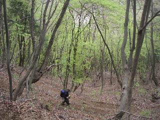 | 下るとますます新緑が美しい.。この山は花の山であると同時に春の新緑、秋の紅葉が楽しめる山だ。 ただ、気楽なハイキングというよりは少し山慣れた人向けかもしれない。 |