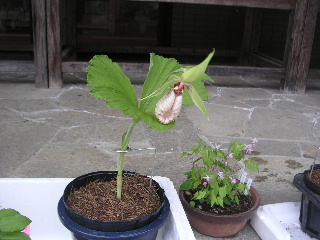 | 特産物のお土産もいろいろ売っている。これはその中の一つ、クマガイソウ。初めて見る。野生は盗掘などで、随分と減ってしまったと聞く。 一鉢1000円。増やして再び山へ戻すということはしないのかな? |