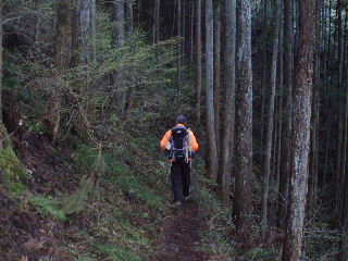| 途中で西ルート、東ルートと分かれますが、もちろんヒカゲツツジ群生地の西ルートへ。坪山は今回4回目ですが、「東ルートは歩いたこと無いね」なんてこの時は話しながら・・・^_^; 杉林に入ると日影でひんやりしてきました。 |