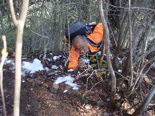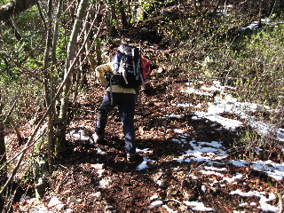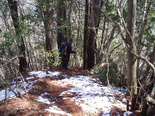 | 迂闊にもコースを間違えていることにまったく気付きませんでした。もうこの雪道の下りを滑らないように下りることで精一杯^_^; トシちゃんは何度滑ったことか(^o^) 知っている山なので今回GPSにはルートを入れてきていませんでした。トラックの記録をとるのが目的で、ルートを確認することも無く必死に下りていきます(^^ゞ |